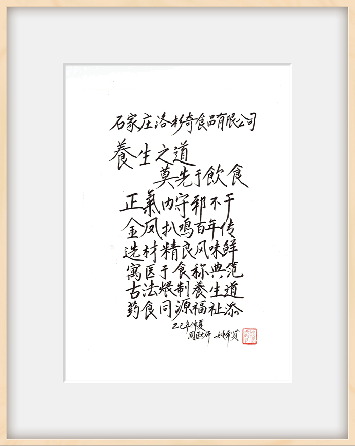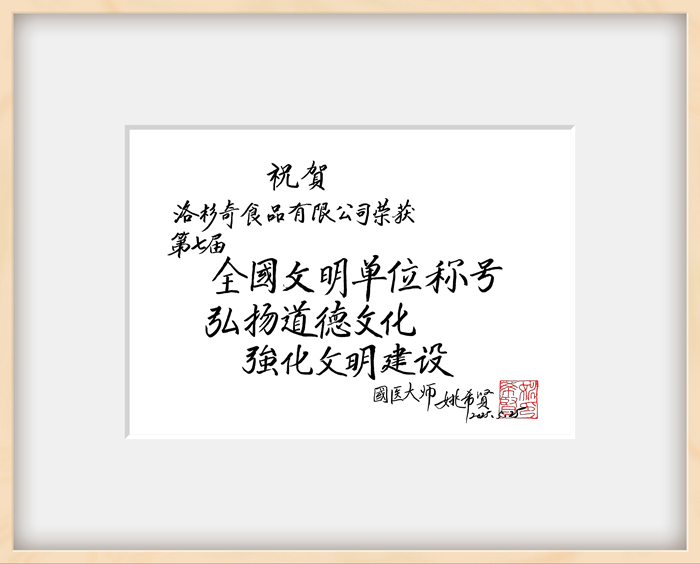 近日,國醫大師、中國中醫科學院學部委員姚希賢先生欣聞公司榮獲“全國文明單位”榮譽稱號,欣然題寫“弘揚道德文化、強化文明建設”、“尚德守信、創新發展”等寄語,殷切期望公司繼續秉承“用匠心、做匠人、鑄匠品”工匠精神,做放心、健康食品,把百年老字號金鳳扒雞這一傳統美食發揚光大。